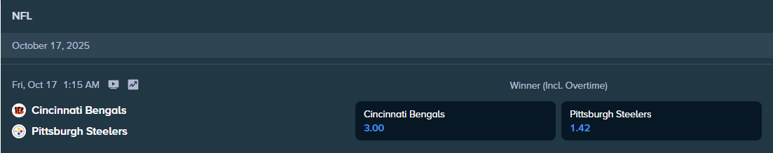 According to Stake.com, the best online sportsbook out there, the betting odds stand at 3.00 (Cincinnati Bengals) and 1.42 (Pittsburgh Steelers).